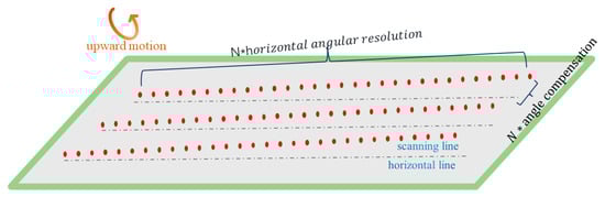 In the above transformation relationship, due to the servo motors’ limited feedback precision and time delay, it is common to represent the pitch angle of all pulses by using the same value in each scanning line. However, this is different in practical scanning processes. As shown in Figure 4, although the frequency is high-speed during each 2D lidar scan cycle, not every pulse has the same pitch angle. Instead, there is a linear relationship based on the direction of pitch motion (assuming uniform scanning). To address this issue, we propose a precise coordinate error correction formula: