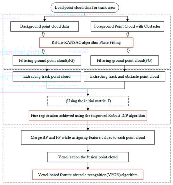 Then, we developed an obstacle detection algorithm suitable for large-scale ground point clouds and mainly discussed several key steps of the algorithm. We preprocessed the point cloud in the track area in the first stage using a statistical outlier filter. In the second stage, to improve the efficiency and robustness of ground point cloud segmentation, we proposed a region-select random sample consensus algorithm (RS-Lo-RANSAC) to segment the ground and extract the track model. In the following stage, we used an improved Robust ICP algorithm to perform registration on the background point cloud (fixed point cloud without obstacles in the track area) and foreground point cloud (real-time point clouds in the track area that may contain obstacles), achieving good consistency. Finally, we proposed an obstacle voxel-based feature obstacle recognition (VFOR) to achieve the stable detection of small obstacles in the railway region.