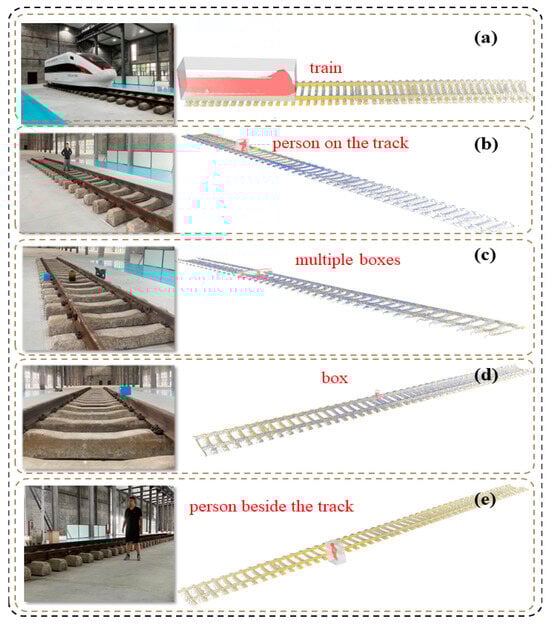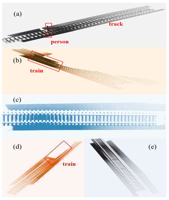 The final visualization result of the algorithm operation is displayed, where the photo is our actual scene photo, and the red point cloud in the transparent cube is the obstacle point cloud detected by our algorithm. The objects are manually labeled as the types of obstacles in red font: (a) stationary train (large obstacle); (b) human obstacle (1.7 m) located 15 m away from the lidar system; (c) three box obstacles (20 cm3, 25 cm3, and 30 cm3) located 10 m away from the system; (d) single box obstacle (20 cm3) located 5 m away from the system; (e) human obstacle (1.7 m) located alongside the track.