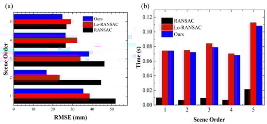 The enhancement of RMSE in Lo-RANSA and RS-Lo-RANSAC compared to traditional RANSAC used for ground segmentation in various scenarios. The “RANSAC (mm)” line represents the specific value of RMSE calculated using the RANSAC algorithm, and the following two lines represent the percentage increase in RMSE obtained by the Lo-RANSAC and RS-Lo-RANSAC algorithms (the calculation formula is the following: ).