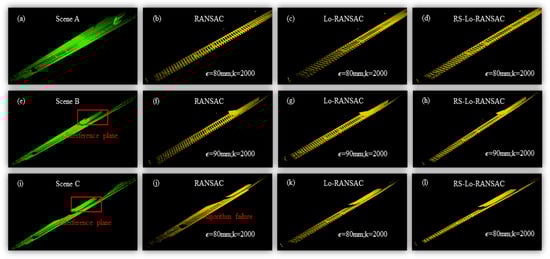We introduced different interference planes to test the segmentation performance of algorithms and set their respective thresholds in different scenarios. Among them, (a–d) are the original point clouds in Scene A and the processing results of the three segmentation algorithms; (e–h) are the original point cloud and the processing results of three segmentation algorithms in Scene B. Similarly, (i–l) are the situations of Scene C.