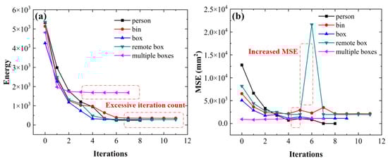 (a) Convergence of energy during the correspondence step of Robust ICP; (b) trend of MSE caused by Robust ICP.