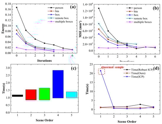 (a) Convergence trend of energy during initial iterations under our convergence strategy; (b) trend of MSE during the first iteration process under our convergence strategy; (c) comparison of runtime between our algorithm and Robust ICP in five random scenarios (different colors represent five different testing scenarios, while the width on the vertical axis represents the time difference between the two algorithms); (d) registration time comparison among traditional ICP algorithm, Robust ICP algorithm, and our algorithm in five random scenarios.
