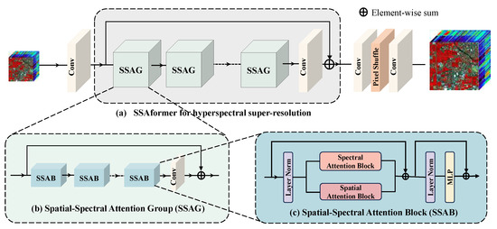 with representing the operations within the deep feature extraction module. As depicted in Figure 1b, the spatial–spectral attention group (SSAG) module comprises several spatial–spectral attention blocks (SSABs), interspersed with convolutional layers and element-wise summations, to progressively refine the feature representation. As illustrated in Figure 1c, each SSAB contains spatial and spectral attention modules, which are the core of the algorithm, and also includes conventional residual connections, multilayer perceptrons (MLPs), and layer normalization.