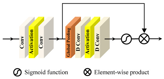 The Spectral attention block (SEB) is specifically designed as an adaptive channel-wise feature extraction mechanism within the network, and its structure is shown in Figure 2. This module starts with two convolution layers and an activation function to generate preliminary spectral feature maps. Global pooling then aggregates global contextual information. Subsequent DC [46] layers are set to adaptively learn the key information of each channel, selectively emphasizing relevant spectral features while suppressing irrelevant ones, thus enhancing channel feature selection. As illustrated in Figure 3, DC can dynamically modify the positions of their sampling points during convolutional operations. The direction and distance of the movements of these sampling points are learnable parameters. With continuous learning by the network, DC can more comprehensively extract detail information such as edges, textures, and other features. After extracting features from all channels, the module extensively learns the most informative spectral features. Finally, the sigmoid activation function ensures that only the most essential features are passed on, implementing spectral attention effectively within the network. The use of DC endows SEB to focus on detailed features in different spectral channels, thereby achieving the goal of spectral attention and enhancing the richness of HSI representation.