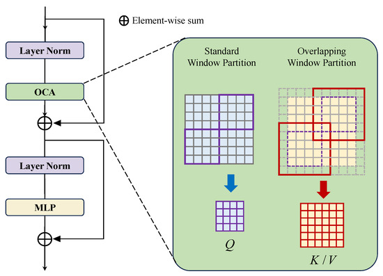 The spatial attention block (SAB) is strategically integrated into our network architecture to enhance spatial feature extraction capabilities, drawing upon the principles of the Swin Transformer [47], as shown in Figure 4. Central to the SAB is the overlapping cross-attention (OCA), which is designed to establish essential cross-window connections that bolster the representational efficacy of window self-attention mechanisms. The SAB combines an OCA layer with a multilayer perceptron, along with necessary layer normalization and residual connections.