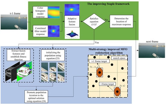 - Based on the improved Staple algorithm, a novel re-detection target-tracking framework is proposed to achieve the long-term tracking of UAVs. In particular, the algorithm adjusts the feature weights adaptively by detecting the response differences between the filter model and the histogram model. Additionally, the improved MFO algorithm is introduced as a re-detection mechanism to enhance the stability of the tracker.