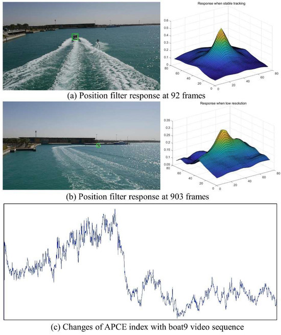 When tracking targets against a complex and changing background in low-altitude airspace, factors like background clutter, target occlusion, and low resolution can cause disturbances in the target’s position and motion, leading to tracking drift and affecting the updating of the feature model, thus resulting in tracking failures. Therefore, this paper adopts two types of re-detection metrics, namely, the maximum response peak and the average peak-to-correlation energy (APCE), proposed by Wang [31], to reflect the confidence evaluation of the response of the correlation filter model in tracking. The criterion for determining whether the tracking state is anomaly is reflected by the magnitude of the re-detection indicator.