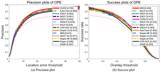 As illustrated in Figure 5, the outcomes of the proposed algorithm (OURS) compared to other trackers in the OPE evaluation on the UAV123 dataset. The figure illustrates that the precision and success rate of the algorithm proposed in this paper are 0.709 and 0.472, respectively, which has the best accuracy among all the comparisons. The algorithm proposed in this paper is 2.0% better than the previous most advanced tracker AutoTrack in terms of precision. Compared to the Staple tracker, OURS achieves performance improvements of 4.3% in precision and 2.7% in success rate, respectively. These results can be attributed to the inclusion of the adaptive feature fusion strategy, which enhances the utilization of dominant weights in the algorithm. Additionally, through the re-detection mechanism for abnormal states, one can enable the improved MFO algorithm with Gaussian initialization based on target motion speed and dynamic adjustment of population iteration rate, ensuring effective tracking in challenging scenarios.