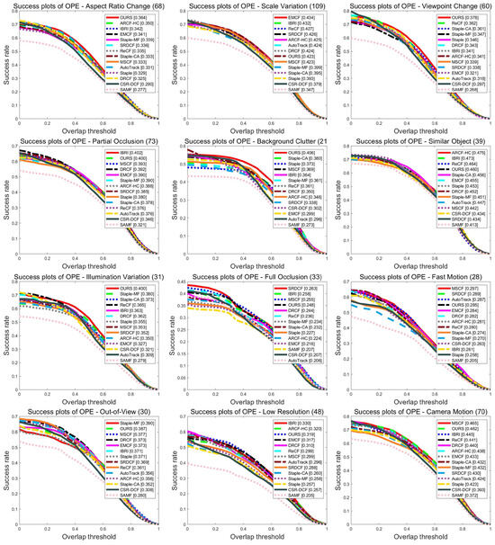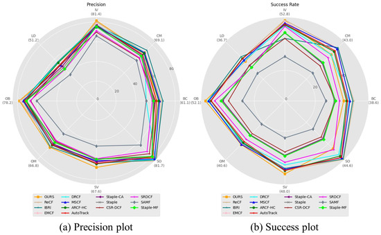 Figure 9 visually depicts a performance comparison of different trackers across the eight attributes of UAVDT. As depicted in the figure, the calculations presented in this article exhibit superior performance compared to the Staple baseline tracker across all attributes. Furthermore, OURS achieves the highest precision and success rate rankings in the SV, OM, IV, and OB attributes.