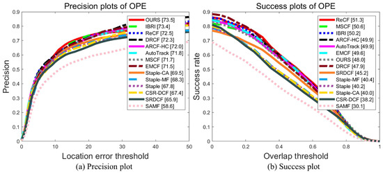 Figure 8 presents the results of our proposed algorithm compared to other trackers in the OPE evaluation on the UAVDT dataset. The precision and success rates were 0.735 and 0.480, marking a 5.7% and 7.8% increase, respectively, compared to the Staple baseline tracker. In terms of precision, OURS performance ranks among the top in comparison to various advanced trackers. As to success rate, OURS has an 8.0% performance improvement compared with the Staple-CA algorithm. The incorporation of a re-detection mechanism in the Staple algorithm enables the proposed algorithm to effectively address environmental interference and target deformation. This is substantiated by the notable improvements in target position prediction accuracy and scale estimation performance observed in the dataset calculations.