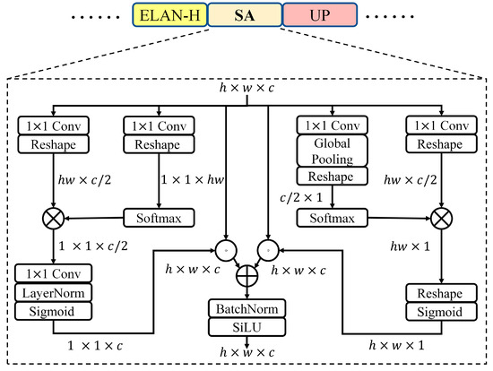 Lane Detection Head. For lane detection, it is likely to lose important information if low-resolution features are utilized, as lane lines typically occupy only a relatively small region within an image. Therefore, as shown in Figure 1e, we introduce multi-scale high-resolution features as the input to capture more details. In practice, we restore to the size of by utilizing ‘ELAN-H’, ‘UP’ and ‘CBS’ modules alternately. However, the above manner fails to capture non-local contextual dependencies and hinders information propagation over long distances. To tackle this limitation, a lightweight SA-based refined module (i.e., ‘SA’ module) is embedded behind each of the ‘ELAN-H’ modules in the lane detection head. This module is built upon the Polarized Self-Attention module [51], which can efficiently capture non-local contextual dependencies between pixels with little computing expense. Specifically, the SA-based refined module includes two main steps: (1) We first collapse the input features of size in channel and spatial direction while maintaining a high resolution in its counterpart direction. We then use Softmax, Sigmoid, LayerNorm and other operations to restore the features to their original sizes. (2) The outputs of the above channel-only and spatial-only self-attention are summed to produce the composition outputs. The composition outputs are then passed through BatchNorm and SiLU activation function [52] to produce the final features of size . More details can be found in Figure 2. In addition, we do not utilize the ‘SA’ module in other task heads as we find that it brings no gain.