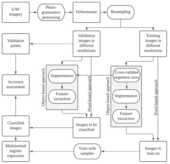 In order to eliminate potential distortions caused by positional inaccuracies when comparing the classification results (see Section 2.6), classifications were performed using resampled variants of the 10 m image rather than the original 20, 40, and 80 m images. Even with a high georeferencing accuracy, slight changes in leaf, shadow, and UAV positions and lighting are inevitable. To exclude these confounding factors from the examination of spatial resolution effects, a resampling approach was preferred. Accordingly, the 10 m image was resampled to 20, 40, and 80 m images by pixel aggregation. In this process, the pixel values of the highest available resolution were averaged to form larger units. Thus, the pixel values of the simulated 20 m flight altitude corresponded to the mean of the four underlying pixels of the 10 m image. The pixel values of the simulated 40 and 80 m image were accordingly based on the mean values of 16 and 64 pixels, respectively, of the original 10 m image. In summary, the resampled 10 m orthomosaic was used for classification, while the flight and preprocessing time of the original imagery was used for a time assessment. An overview of the succeeding procedure, including the training, classification, and accuracy assessment, is provided in Figure 2.