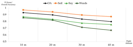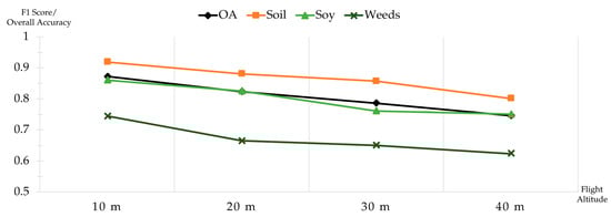 An illustrative comparison of the accuracies of the individual classes across flight altitudes is provided in Figure 3, depicting the F1 scores of each class as well as the OA. The comparison reveals that the soil accuracy was clearly the highest, followed by that of the soy and weeds. A notable decline in accuracy was discernible within the altitude range of 20 to 40 m, with the weed class exhibiting the most substantial drop of over 10 percent.