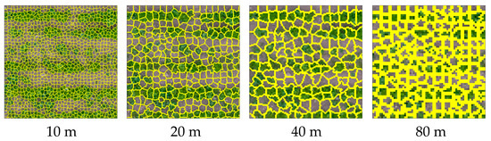 An exemplary illustration of the effect of the segment sizes on segmentation in relation to spatial resolution is provided in Figure 4. While the segments covered one or two leaves in the 10 m scenario, beginning from 20 m on, several leaves were conflated into a segment. At 40 and especially at 80 m, an increasing number of segments consisting of numerous leaves, partially from multiple plants, can be observed.