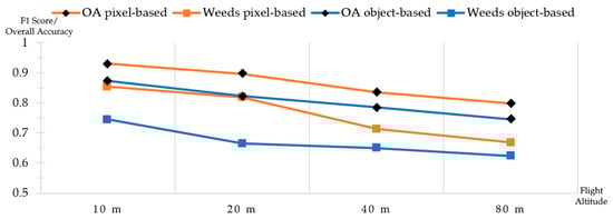 The classification results highlight a distinct relationship between flight altitude and accuracy. For both pixel-based and object-based classification, the accuracy diminished significantly with a decreasing resolution. In particular, the F1 scores of the weeds demonstrated that the accuracy of object-based classification experienced a significant decline between the altitudes of 10 and 20 m. In contrast, the weed accuracy of the pixel-based classification dropped later between 20 and 40 m. Therefore, if comprehensive weed mapping that can also detect small weed patches is desired, flying at altitudes of 10 or 20 m and performing pixel-wise classification would be suitable. When only a broad overview of the study area is required, the flight can be conducted between 40 and 80 m. These lower resolutions are particularly appropriate when the weeds occur in extensive patches, as this ensures the availability of adequate training pixels and minimizes the weakness of not detecting small weed patches, which is less crucial in this context.