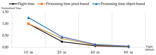 On average, the flight time increased by a factor of 3.76 as the flight altitude was halved. A similar exponential trend, albeit less pronounced, was observed in terms of the data-processing time. The average time required for pixel-based classification decreased by a factor of 3.20 as the flight altitude was halved, while the average time required for object-based classification decreased by a factor of 2.94. A comparison of the two approaches indicated that object-based classification took 33.26 percent longer on average. However, the absolute difference in time diminished as the quantity of data to be processed decreased. To facilitate a hardware- and area-size-independent comparison, a normalized diagram is presented (Figure 8), displaying the time curves for the flight and processing times, which illustrates the exponential trend of the relationship.