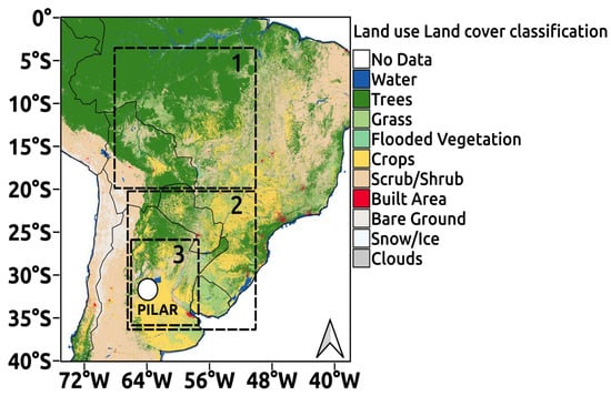 LULC classification over the study area from ESA Sentinel-2 imagery at 10 m resolution (shaded). The white dot indicates the location of Pilar Observatory (31°41′S, 63°53′W, 338 m ASL), while the black squares indicate the location of the Amazonia region (1), the southeastern South America (SESA) region (2), and the northern and central Argentina (NCA) region (3).