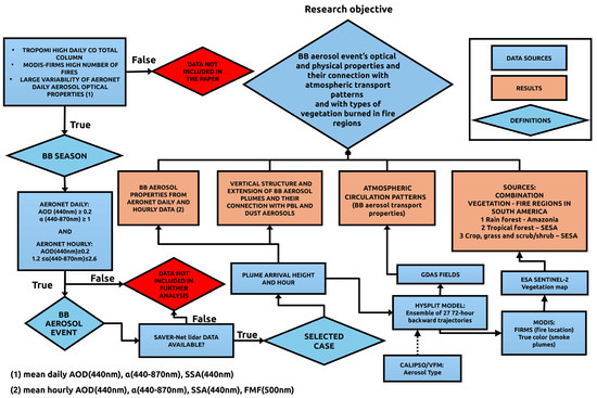 The following method describes the procedures implemented to characterize various aspects of the July–December 2019 BB aerosol events, including the aerosols’ optical and physical properties, the atmospheric circulation patterns, and the types of vegetation that were present in the burned areas. The schematic flowchart of methods is shown in Figure 2.