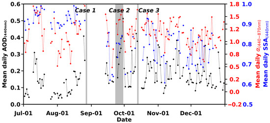 Daily mean AOD(440nm) (black line, left axis), daily mean α(440–870nm) (red line, right axis) by AERONET Level 2.0, and daily mean SSA(440nm) (blue line, right axis) by AERONET Level 1.5 at the Pilar Observatory site from July through December 2019. The gray shades indicate the three periods in which BB aerosol event criteria have been met and lidar information was available at the study site. These three cases are indicated as Case 1, Case 2, and Case 3.