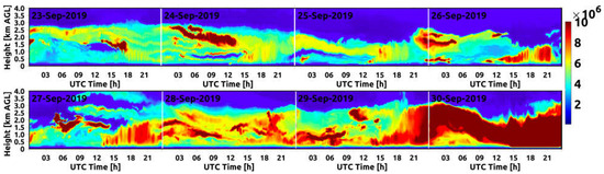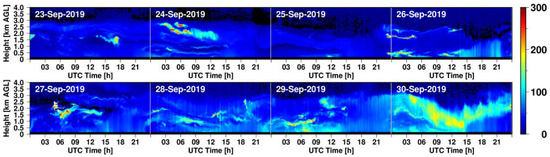 Range-corrected SAVER-Net lidar signal at 1064 nm (arbitrary units) at the Pilar Observatory site from 23 to 30 September 2019.