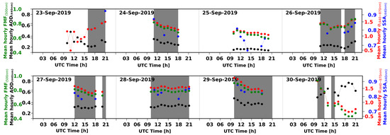 Time series of hourly averages of AOD(440nm) (black line, left axis), FMF(500nm) (green line, left axis), and α(440–870nm) (red line, right axis) by AERONET Level 2.0, and SSA(440nm) (blue line, right axis) by AERONET Level 1.5 at the Pilar Observatory site for 23–30 September 2019. Hourly AERONET Level 1.0 data were used on 23 and 30 September. The gray shade indicates the time span when BB aerosols were found at the site based on hourly AERONET data.