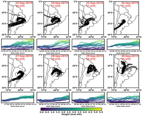 Figure 11 shows the results for the 27-member ensemble of HYSPLIT back trajectories initialized on 27 September 2019 at 12 UTC at 1.5 km AGL at the PO site. This figure also shows the superposition of the information of the MODIS True Color image (27 September 2019, 14:05 UTC) and of the MODIS-FIRMS detected fires contained within a range of 50 km of each back-trajectory ensemble member. Back trajectories suggest that the sources of the BB aerosols reaching PO were associated with a short-range transport regime driven by a weak anticyclonic circulation. In general, the height of back trajectories ranged between 1.5 and 4 km AGL. These heights decreased with time, which is consistent with synoptic-scale downward motions associated with the anticyclonic flow. The combination of the MODIS-FIRMS fires and the time–height HYSPLIT back-trajectories data shows that the most likely sources of BB aerosols were located northeast of the SESA region up to one day before reaching PO. At the BB aerosol source region, the fire density reached 60 fires per km2 and the land cover and land use were dominated by cropland, grassland, and scrub/shrub. At the beginning of the back trajectories, the height of the air parcels was above 2.5 km AGL, which is most likely above the PBL top. Thus, it is unlikely that the fires that were close to the back trajectories during this period contributed to the BB aerosol loading observed at the PO site. The total amount of aerosols produced at the detected fires during this period seems to be relatively low since the MODIS True Color composition did not clearly show smoke plumes associated with the detected fires in northern and central Argentina (and particularly those most likely contributing to BB aerosol loading at the PO site, yellow and red dots in Figure 11).