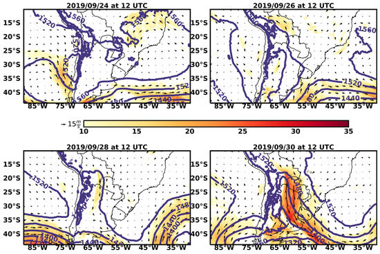 Wind speed (shaded ms−1), wind direction vectors (arrows), and geopotential height (contours, mgp) at 850 hPa for 24 September 2019 at 12 UTC (upper left), 26 September 2019 at 12 UTC (upper right), 28 September 2019 at 12 UTC (lower left), and 30 September 2019 at 12 UTC (lower right) from the 0.25° GDAS/FNL analysis.