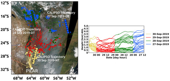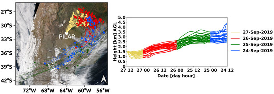 (left panel) 72-hour backward trajectories determined with the HYSPLIT model with 27 members starting at the Pilar Observatory site at 1.5 km AGL on 27 September 2019 at 12 UTC. The lines show the air mass back trajectory during 24–27 September. Different colors correspond to different dates, as indicated in the right panel legend. The dots indicate the location of fire points, and their color indicates the day on which they were within a 50 km range of a back-trajectory ensemble member. The shade corresponds to the True Color image taken by MODIS at 14:05 UTC on 27 September 2019. (right panel): Back-trajectory heights as a function of time. Different colors indicate different days, as in the (left panel).