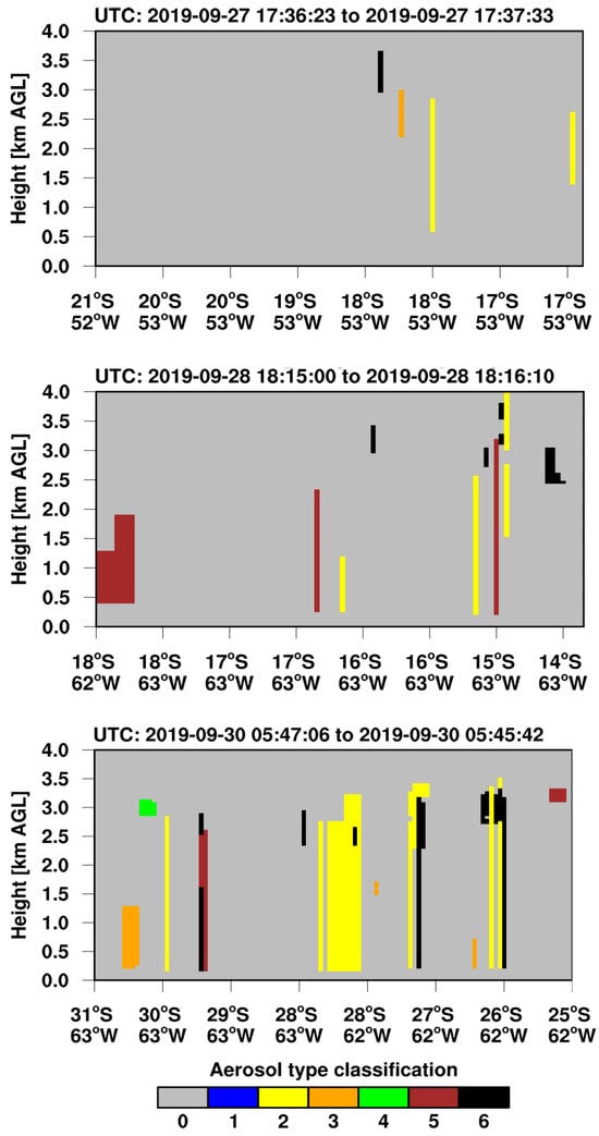 The upper, middle, and lower figures show the aerosol layers measured on the daytime (DT, ascending) and nighttime (DT, descending) trajectories of the CALIOP instrument aboard the CALIPSO satellite for 27, 28, and 30 September 2019. Aerosol types are abbreviated in the legend beneath the image: 0, “Not determined”; 1, “Marine”; 2, “Desert dust”; 3, “Polluted continental/smoke”; 4, “Clean continental”; 5, “Polluted dust”; 6, “Elevated smoke”. The images correspond to trajectories identified with blue (upper panel), green (middle panel), and yellow (lower panel) squares in Figure 12.