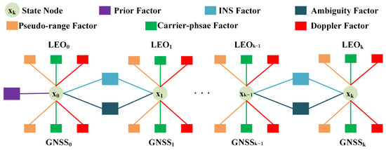 Similarly, the pseudo-range factor, carrier-phase factor, and Doppler factor of LEO can be obtained. In this paper, the GNSS factor, INS factor, and LEO factor are proposed. Therefore, the optimal state set X = {x1, x2, x3, …, xk, …} can be solved as:
