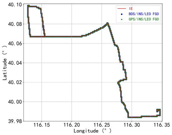 In the experiment, the reference station was set up nearby in an open environment as far as possible to avoid the surrounding signal reflectors. The GNSS RTK/INS tight combination algorithm provided by NovAtel Inertial Explorer 8.7 (IE 8.7) commercial software generates the positioning reference values. To ensure time alignment for integrated navigation, GPST is used uniformly for GNSS, LEO, and INS. The offset between the GNSS antenna and the center of the IMU is measured during the experiments to ensure spatial alignment. Please refer to Table 2 for a detailed processing strategy.