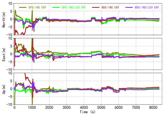 The variation of the position errors of the EKF GPS/INS TCI, the LEO-enhanced EKF GPS/INS TCI, the EKF BDS/INS TCI, and the LEO-enhanced EKF BDS/INS TCI with respect to the reference value in the n-frame is shown in Figure 5. It can be seen that the position errors of the GPS/INS TCI and the BDS/INS TCI were worse in comparison to the results with the inclusion of the LEO, which is mainly influenced by the availability of the GPS and BDS satellites significantly. Figure 6 shows the RMSE of the corresponding position error. Comparing the results of LEO-enhanced GPS/INS and LEO-enhanced BDS/INS TCI with those without LEO enhancement, the RMSE of the LEO-enhanced GPS/INS TCI improved from 1.23 m, 1.31 m, and 0.71 m to 1.08 m, 1.18 m, and 0.63 m, in the north, east, and vertical directions, respectively, providing improvements of 11.69%, 9.72%, and 10.46%; the RMSE of the LEO-enhanced BDS/INS TCI improved from 1.85 m, 1.75 m, and 2.14 m to 1.08 m, 1.18 m, and 0.63 m, in the north, east, and vertical directions, respectively, providing improvements of 3.82%, 11.12%, and 21.25%. Obviously, the positioning accuracy and convergence performance of GPS and BDS are significantly improved after obtaining LEO satellite augmentation.