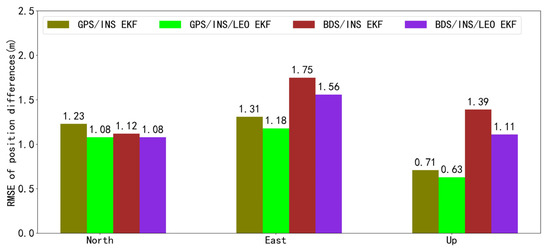 RMSE of position differences for the GPS/INS, LEO-enhanced GPS/INS, BDS/INS, and LEO-enhanced BDS/INS tightly coupled integration based on EKF.