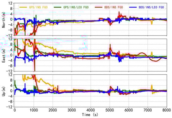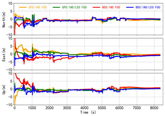The position differences of the FGO GPS/INS, LEO-enhanced GPS/INS, BDS/INS, and LEO-enhanced BDS/INS tightly coupled integration under the low-observability environment.