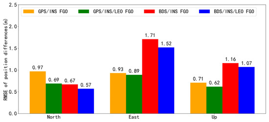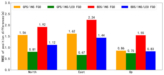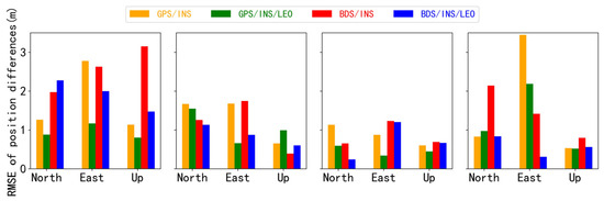 RMSE of position differences for the GPS/INS, LEO-enhanced GPS/INS, BDS/INS, and LEO-enhanced BDS/INS tightly coupled integration based on FGO.