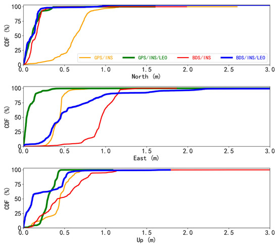 In order to further demonstrate the positioning performance of the LEO-enhanced GNSS/INS TCI, the paper calculates the cumulative probability distribution of the error. In general, the cumulative distribution function (CDF) is used to estimate the probability distribution of the positioning error. Based on the CDF of the position offsets for the FGO GPS/INS, LEO-enhanced GPS/INS, BDS/INS, and LEO-enhanced BDS/INS shown in Figure 9, the percentages for those epochs with position offsets within 0.5 m in the north direction were 26.6% and 99.8%, respectively, for the GPS/INS and LEO-enhanced GPS/LEO; such percentages in the east direction were 90.0%, and 99.7%, and they were 71.6%, and 99.9% in the vertical direction. The percentages for those epochs with position offsets within 1 m in the north direction were 99.1% and 99.8%, respectively, for the BDS/INS and LEO-enhanced BDS/LEO; such percentages in the east direction were 65.7%, and 89.4%, and they were 94.9% and 99.1% in the vertical direction. Given the above CDF trends, the LEO-enhanced GNSS/INS TCI offer better stability and higher accuracy than without LEO.