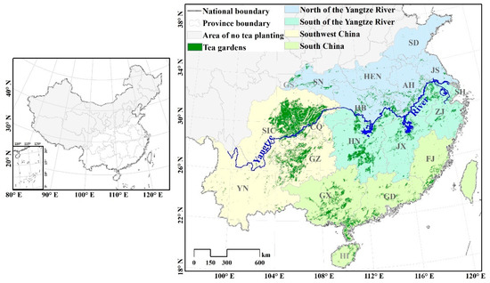Climate is one of several critical factors that determine where crops are planted. Tea plants can be grown over a wide range of climatic conditions, and can tolerate light snow or frost, as well as tropical and subtropical climates with high humidity. Previous research has delineated the major tea planting regions in mainland China to be between 20° and 37°N and 98° and 121°E [13], covering an area of approximately 2.55 × 106 km2 and accounting for approximately 26.58% of the area of mainland China. It includes all or parts of 17 provinces and two municipalities: Shandong (SD), Henan (HEN), Shaanxi (SN), Gansu (GS), Jiangsu (JS), Anhui (AH), Hubei (HB), Shanghai (SH), Zhejiang (ZJ), Jiangxi (JX), Hunan (HN), Sichuan (SIC), Chongqing (CQ), Yunnan (YN), Guizhou (GZ), Fujian (FJ), Guangdong (GD), Guangxi (GX), and Hainan (HI) [3] (Figure 1).