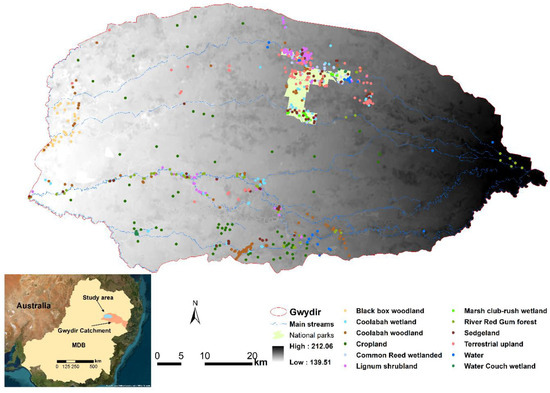The distribution of field sampling plots in the Gwydir Wetland Complex, located downstream of Gwydir catchment in the Murray–Darling Basin of Australia (inset map).