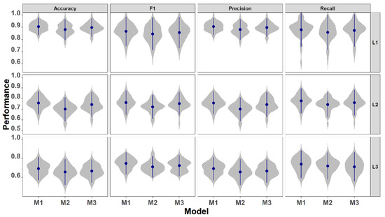 The distribution of model performance metrics generated by resampling the predictions using the same testing dataset. Dots are the mean, vertical bars are the standard deviation, and shadows are the distribution of the 50 resamples. M1 = model with all predictors; M2 = model with basic predictors and statistical features; and M3 = model with basic predictors and HANTS features. L1, L2, and L3 are class level 1 (4 types), level 2 (8 types), and level 3 (12 types).