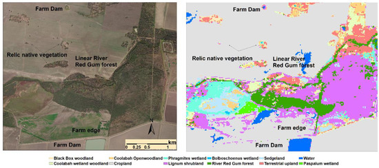 Virtual comparison between aerial photo and predicted landcover types of a section in Gwydir Wetland System showing the correct identification of small farm dams, relic native vegetation patches, and linear river red gum forests along creeks.