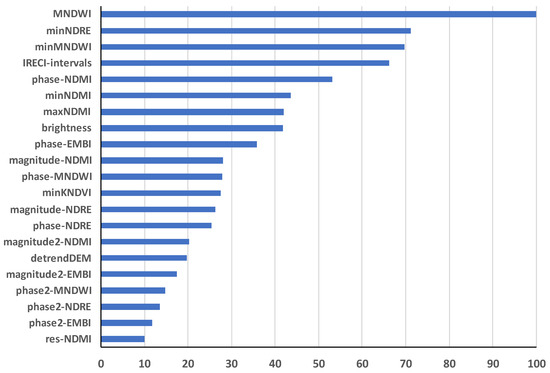 Importance of the top 21 predictors with importance of over 10. Importance is scored so the most important variable has a score of 100, and the variable with least contribution to the performance of the model has a score of 0. Res-NDMI is the residuals of the harmonical fitting of NDMI time series.