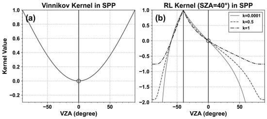 The shapes of KVinnikov and KRL in the solar principal plane (SPP) with the SZA of 40° are shown in Figure 2. The KVinnikov is a bowl-shaped function symmetrical about the VZA (Figure 2a), which can capture the pattern of the gap fraction function well []. In Figure 2b, the adjustable hotspot width parameter k in KRL improves the fitting accuracy in the hotspot region to better depict the hotspot signatures []. Both KVinnikov and KRL were normalized to 0 at the nadir.