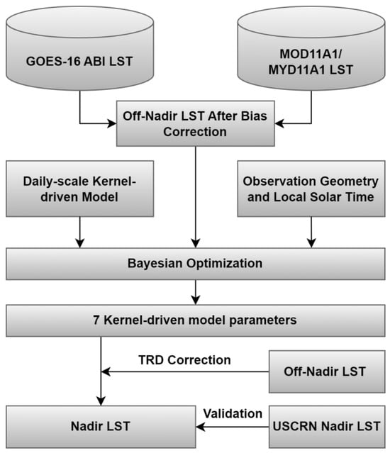 The general process for correcting the TRD effect is shown in Figure 3. Firstly, the GOES-16 and MODIS LST data were extracted using a nearest neighbor method to match the in situ LST; this was acceptable as the impact of resolution difference was weak, which we knew because the 2 km scale thermal homogeneity of in situ sites was carefully evaluated. Moreover, the GOES-16 LST was corrected to the MODIS LST using a linear regression method (i.e., TMODIS = a * TGOES + b). The parameters a and b were calibrated using nighttime LST matchups when the absolute difference in VZA was less than 15° and the time difference was no more than 30 min. This relationship was further applied to daytime LSTs. Then, the corrected off-nadir LSTs, viewing geometries (i.e., VZA, SZA, and RAA), and local solar times were jointly applied to drive the multitemporal kernel-driven model using a Bayesian optimization method. After calibrating the 7 unknown parameters in Equation (6), fGap and fHotspot can be obtained to estimate the nadir LST with the input of the off-nadir LST.