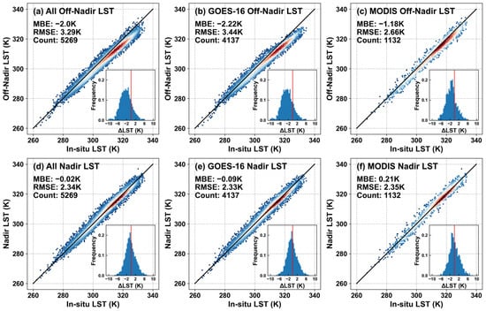 A direct comparison between the in situ LST and satellite LST before (off-nadir LST) and after (nadir LST) TRD correction is shown in Figure 4. Notably, a significant underestimation can be observed in both the GOES-16 and MODIS LST products, particularly for LST values exceeding 300 K (Figure 4a–c). The RMSE and MBE for off-nadir LST are 3.29 K and −2.0 K for all LST values (Figure 4a). Following TRD correction, the corrected nadir LST exhibits an RMSE reduction of 0.95 K (29%) and a significant reduction in absolute MBE (Figure 4d), with an RMSE (MBE) of 2.34 K (−0.02 K). The histogram in Figure 4a,d demonstrates the effective reduction in systematic bias and variance in ∆LST (i.e., the satellite LST minus in situ LST). This correction trend is consistent for both GOES-16 and MODIS off-nadir LST products. Specifically, the RMSE of GOES-16 LST is reduced from 3.44 K to 2.33 K with a reduction of 1.11 K (32%), while the MBE is reduced from −2.22 K to −0.09 K after TRD correction. Similarly, the RMSE (MBE) for MODIS LST decreases from 2.66 K (−1.18 K) to 2.35 K (0.21 K) with an RMSE reduction of 0.31 K (12%) and a notable elimination of systematic bias. Overall, the proposed correction method removed the severe underestimation in off-nadir LST products, achieving a high accuracy after TRD correction.