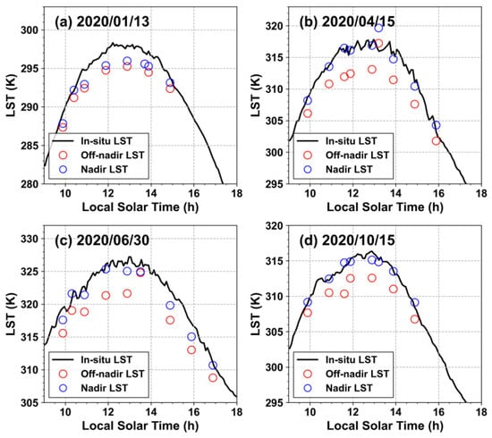 The off-nadir and nadir LST on (a) 2020/01/13; (b) 2020/04/15; (c) 2020/06/30; and (d) 2020/10/15 at the NM Las Cruces 20 N site.