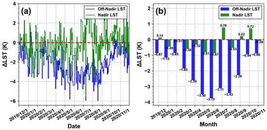 Figure 7a shows detailed information about the daily variation in ∆LST. The results show that the off-nadir ∆LST exhibits a significant seasonal variation trend. The ∆LST is usually within −2 K in autumn and winter but exceeds −2 K during spring and summer, with the maximum absolute value approaching −6 K in summer. In contrast, the corrected ∆LST generally varies within the range of ±2 K over one year, indicating a significant reduction in temporal dependence.