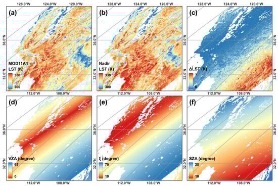The spatial distribution of (a) MOD11A1 off-nadir LST; (b) the corrected nadir LST; (c) the LST difference, i.e., (b) minus (a); (d) the VZA; (e) the angle between the solar and view directions; and (f) the SZA, i.e., the angle between the solar and nadir directions.