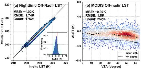 (a) The accuracy of nighttime LST products; (b) the angular dependence on the VZA for the MODIS nighttime off-nadir LST.
