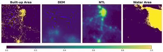 Visualization of the dataset sample. The urban built-up area images and the water area images are binary images with pixel values of 0 and 1, respectively. Each pixel in the DEM and NTL images represents the average value of the corresponding geographic area, and the pixel value is scaled to 0-1.
